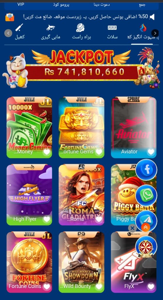 The display games are Aviator, Fortune Gems, Crazy 777, Dragon Tiger, Money Coming, Live Sports, Live casino, Fruit games, Slots and Lottery games. You can select any of them and start betting to win unlimited cash.