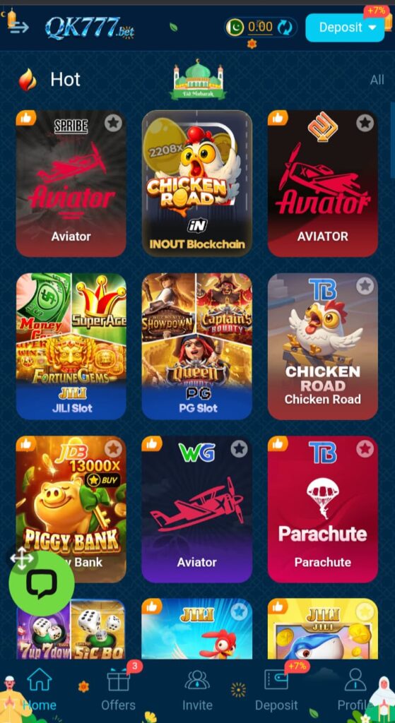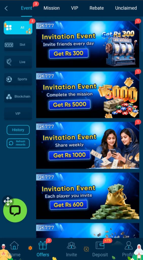 Big rewarding games like Fortune Gems, Dragon Tiger, Money Coming, and Crazy 777 are listed at the top of this casino. Live chat is available for support. You can take help from it any time you want. Qk777 App is offering high-quality games, features, and active functions. Furthermore, you will learn new skills and techniques to earn real money from casino games. Refer and win real cash prizes from this app.